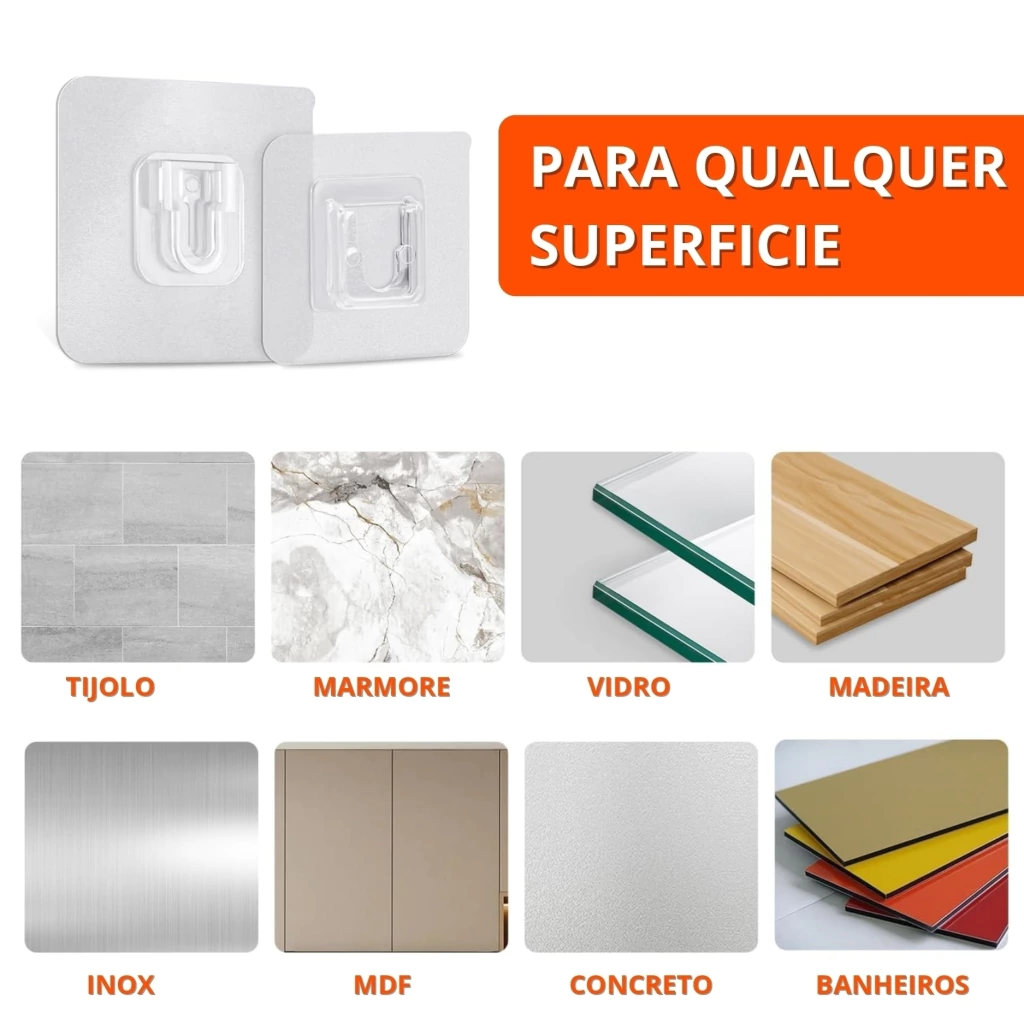 Nunca mais faça furos na parede ou danifique azulejos com o adesivo gancho! Este produto é a solução perfeita para quem quer pendurar objetos em superfícies lisas, como madeira, vidro, mármore, superfície metálica, plástico, azulejo e geladeira ou eletrodomésticos, sem precisar de ferramentas ou danificar a estética e estrutura da sua casa.